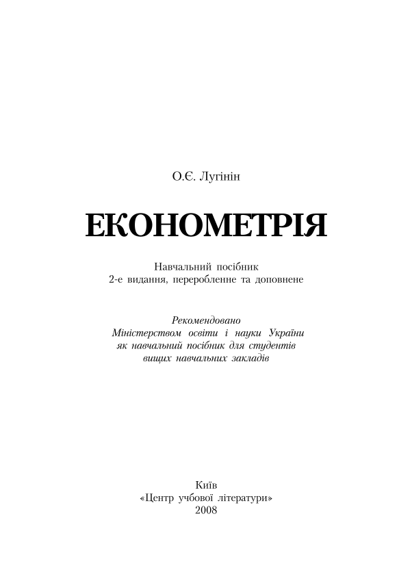 Лугінін, О. Є. Економетрія [Електронний ресурс] : навчальний посібник / О. Є. Лугінін. – 2-ге вид., переробл. та допов. – Електрон. текстові дані. – К. : Центр навч. літератури, 2008. – 1 электрон. опт. диск (CD-ROM), 24,7 Мб. – (Електронні видання). – 60,00 грн.