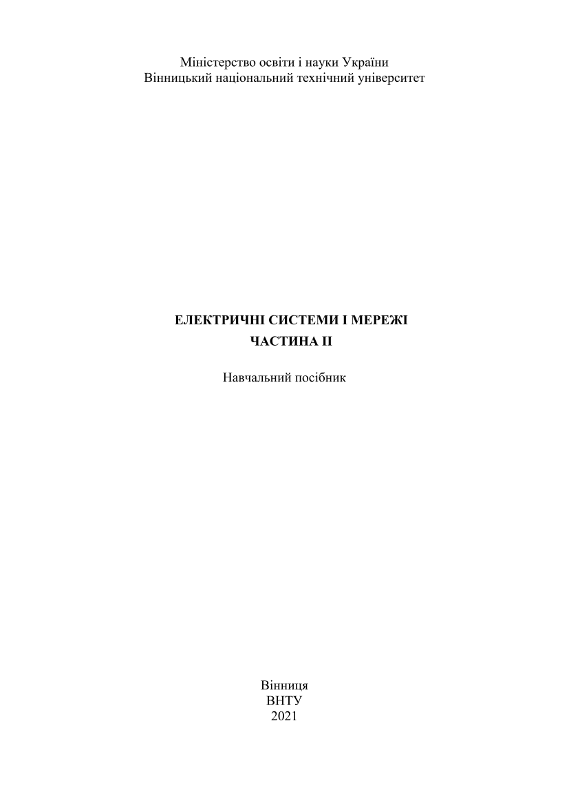 Електричні системи і мережі [Електронний ресурс] : навчальний посібник. Ч. II / Ю. В. Малогулко, О. Б. Бурикін, Т. Л. Кацадзе, В. В. Нетребський ; ВНТУ ; за ред. П. Д. Лежнюка. – Електрон. текст. дані. – Вінниця : ВНТУ, 2021.