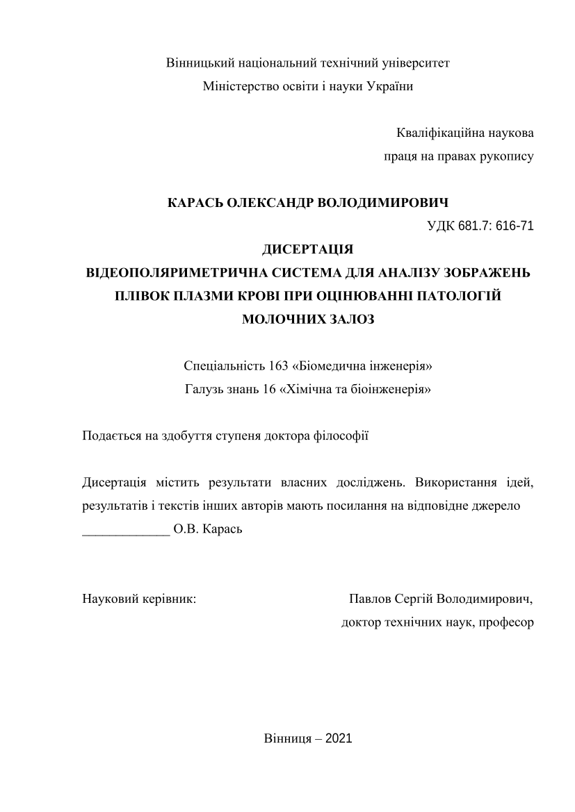 Карась, О. В. Відеополяриметрична система для аналізу зображень плівок плазми крові при оцінюванні паталогій молочних залоз [Електронний ресурс] : дис. ... д-ра філософії : спец. 163 / Карась Олександр Володимирович ; ВНТУ. – Електрон. текст. дані. – Вінниця, 2021. – Бібліогр.: с. 128-144.