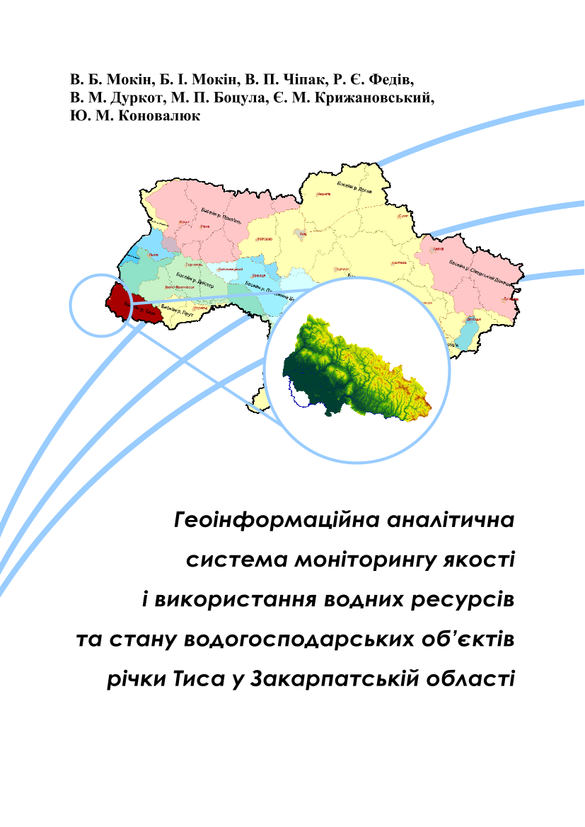 Г35          Геоінформаційна аналітична система моніторингу якості і використання водних ресурсів та стану водогосподарських об’єктів річки Тиса у Закарпатській області [Електронний ресурс] : методичний посібник / В. Б. Мокін, Б. І. Мокін, В. П. Чіпак [та ін.] ; ВНТУ ; Держ. ком. України по водному господарству. – Електрон. текстові дані. – Вінниця : УНІВЕРСУМ - Вінниця, 2010.