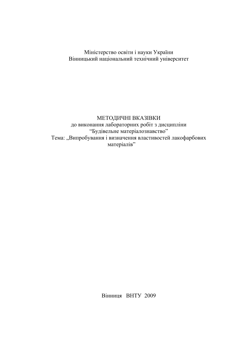 Методичні вказівки до виконання лабораторних робіт з дисципліни "Будівельне матеріалознавство". Тема: "Випробування і визначення властивостей лакофарбованих матеріалів" [Електронний ресурс] / ВНТУ ; уклад.: В. П. Очеретний, В. П. Ковальський. – Електрон. текстові дані. – Вінниця : ВНТУ, 2009.