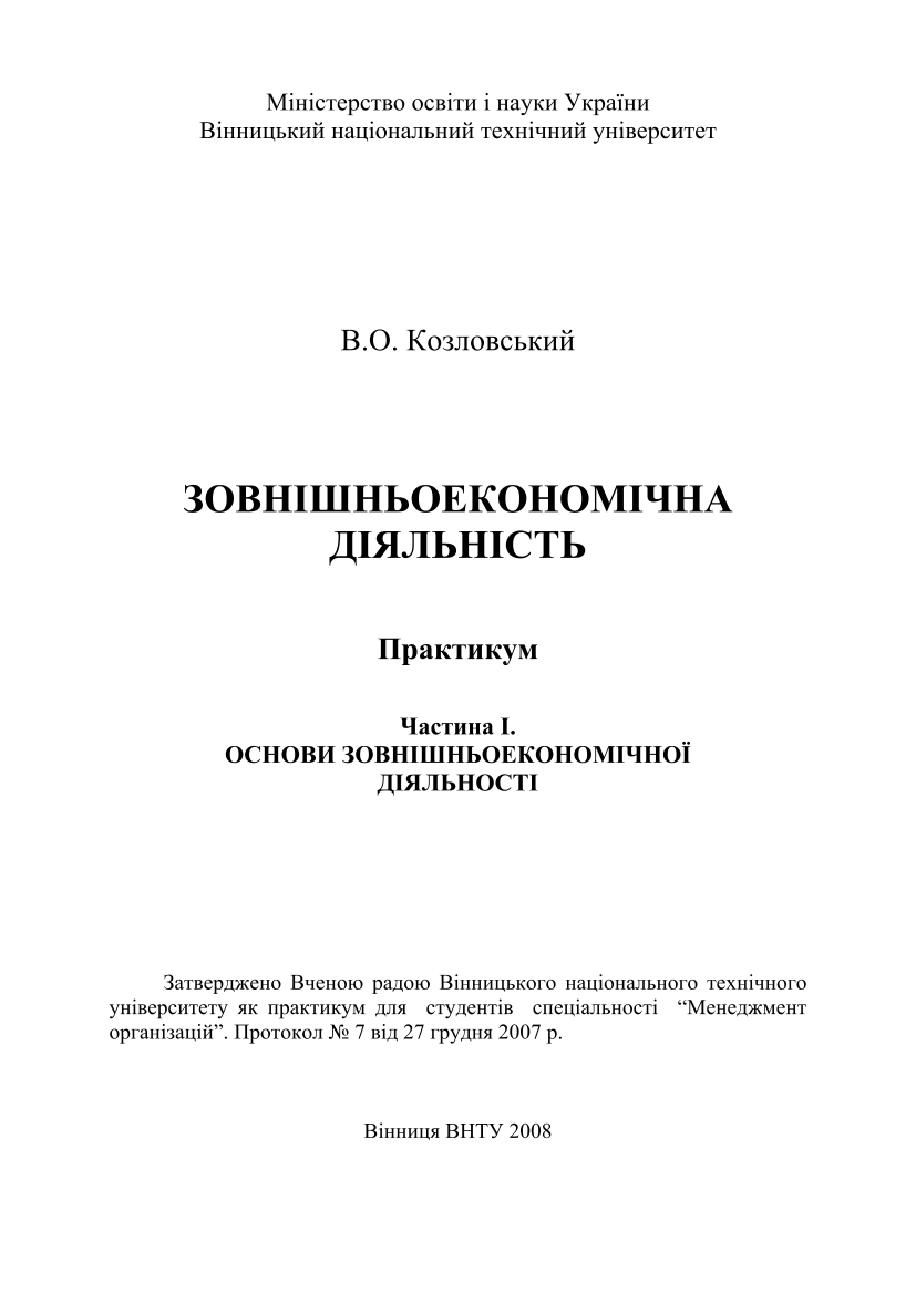Козловський, В. О. Зовнішньоекономічна діяльність [Електронний ресурс] : практикум. Ч. 1 : Основи зовнішньоекономічної діяльності / В. О. Козловський ; ВНТУ. – Електрон. текстові дані. – Вінниця : ВНТУ, 2008.