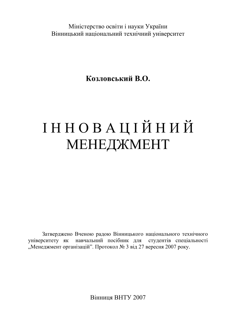 Козловський, В. О. Інноваційний менеджмент [Електронний ресурс] : навчальний посібник / В. О. Козловський ; МОН України, ВНТУ. – Електрон. текстові дані. – Вінниця : ВНТУ, 2008.