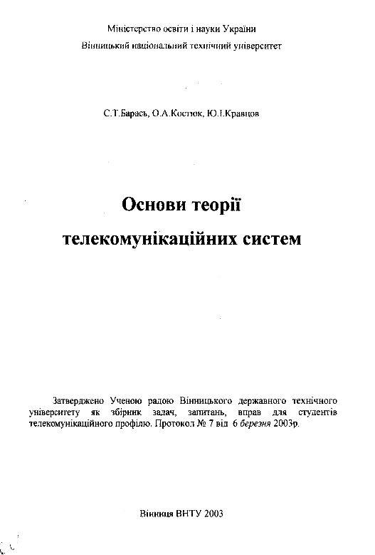 Барась, С. Т. Основи теорії телекомунікаційних систем [Електронний ресурс] : навчальний посібник / С. Т. Барась, О. А. Костюк, Ю. І. Кравцов ; МОН України. – Електрон. текстові дані. – Вінниця : ВДТУ, 2003.