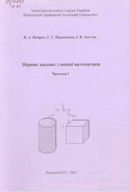 Петрук, В. А. Збірник завдань з вищої математики [Електронний ресурс] : Навчальний посібник. Ч.1 / В. А. Петрук, Г. Г. Кашканова, І. В. Хом'юк. – Електрон. текстові дані. – Вінниця : ВДТУ, 2001.