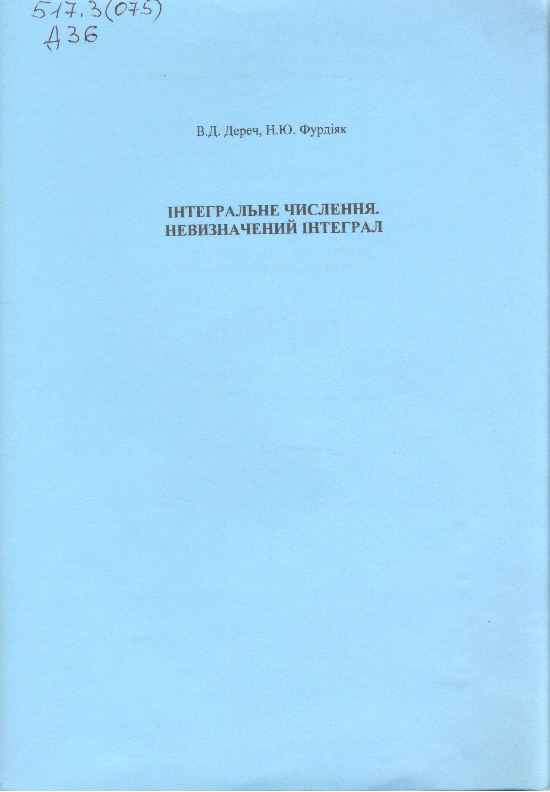 Дереч, В. Д. Інтегральне числення. Невизначений інтеграл [Електронний ресурс] : Навчальний посібник / В. Д. Дереч, Н. Ю. Фурдіяк ; МО і науки України. – Електронні текстові дані. – Вінниця : ВДТУ, 2002.