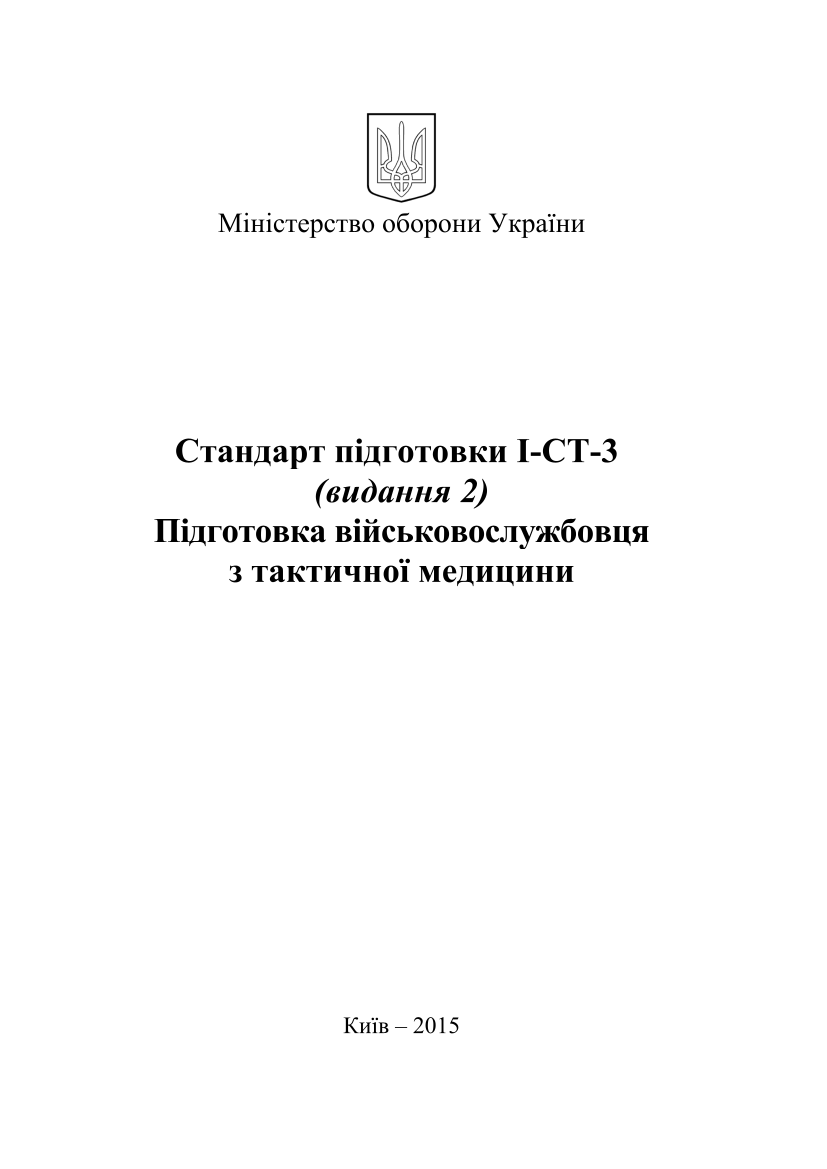 Стандарт підготовки I-СТ-3 [Електронний ресурс] : підготовка військовослужбовця з тактичної медицини / Мін-во оборони України. – вид. 2-ге. – Електрон. текст. дані. – Київ : МП Леся, 2015.