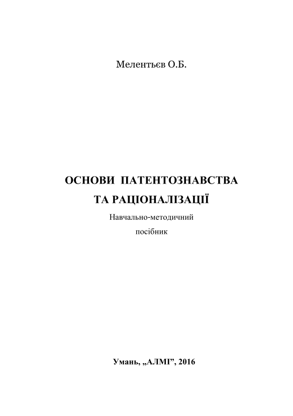 Мелентьєв, О. Б. Основи патентознавства та раціоналізації [Електронний ресурс] : навчально-методичний посібник / О. Б. Мелентьєв. – Електрон. текст. дані. – Умань : АЛМІ, 2016.