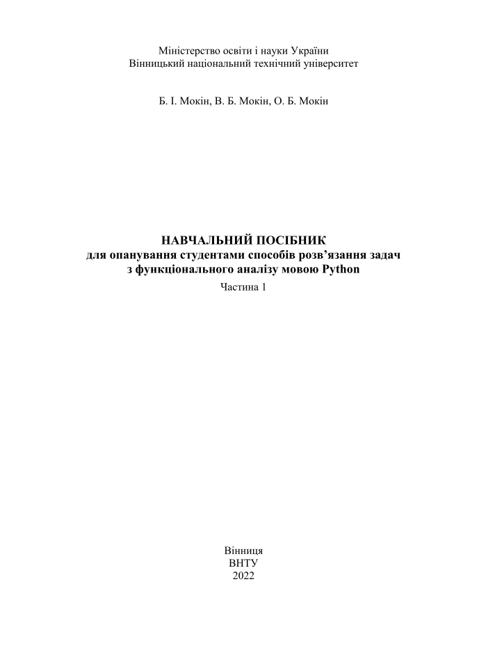 Мокін, Б. І. Навчальний посібник для опанування студентами способів розв'язання задач з функціонального аналізу мовою Python [Електронний ресурс]. Ч. 1 / Б. І. Мокін, В. Б. Мокін, О. Б. Мокін ; ВНТУ. – Електрон. текст. дані. – Вінниця : ВНТУ, 2022.