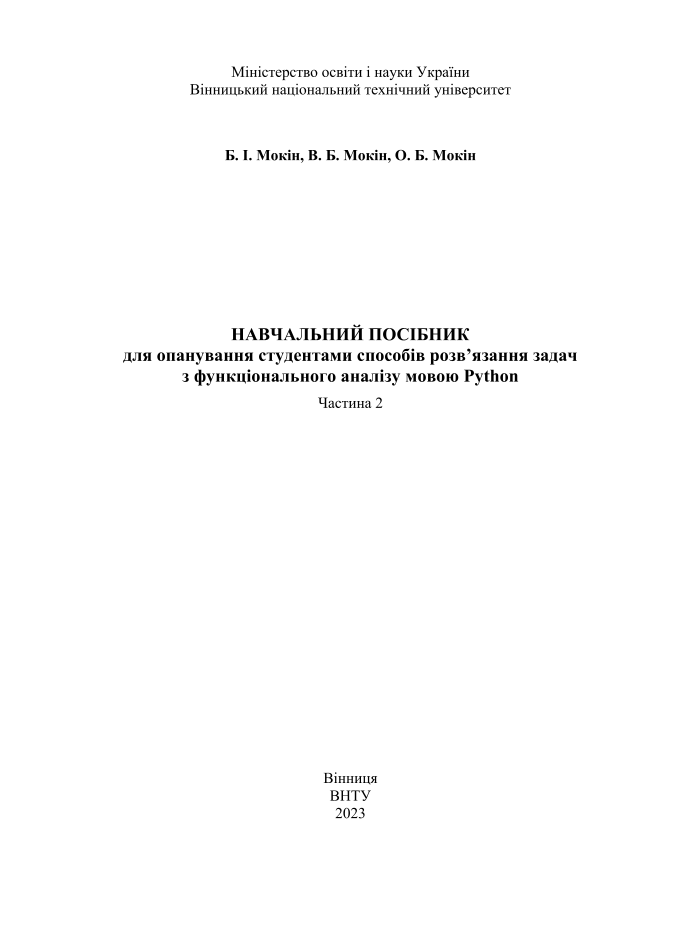 Навчальний посібник для опанування студентами способів розв'язання задач з функціонального аналізу мовою Python [Електронний ресурс]. Ч. 2 / Б. І. Мокін, В. Б. Мокін, О. Б. Мокін ; ВНТУ. – Електрон. текст. дані. – Вінниця : ВНТУ, 2023.