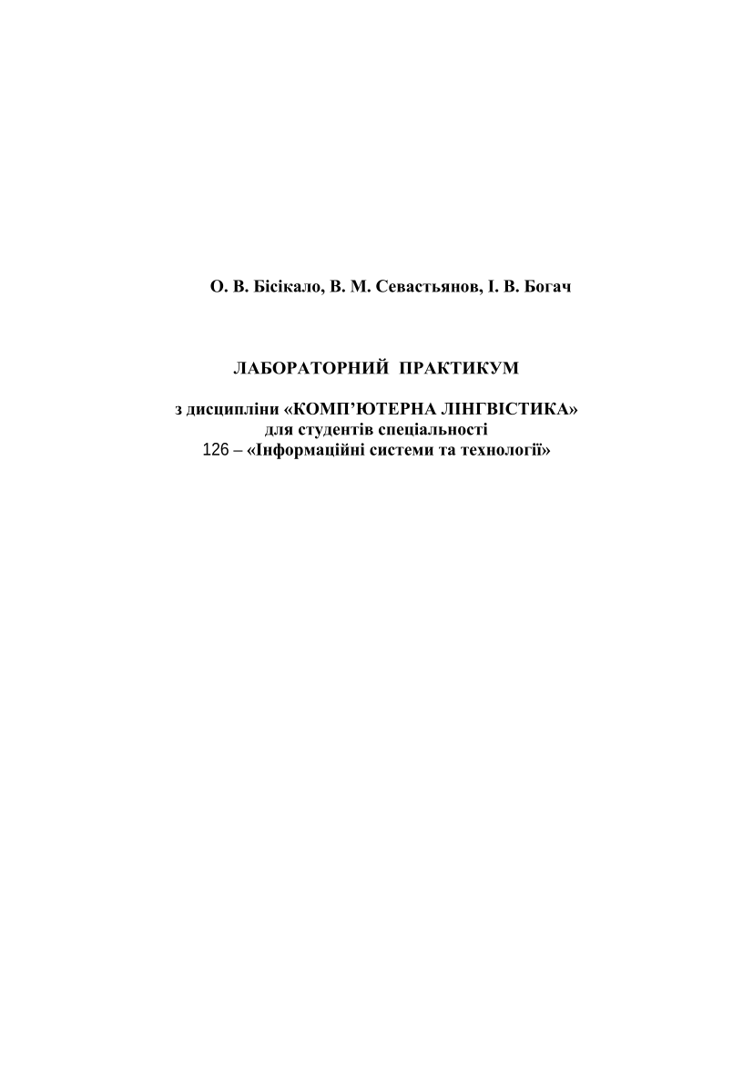 Лабораторний практикум з дисципліни "Комп'ютерна лінгвістика" для студентів спеціальності 126 – "Інформаційні системи та технології" [Електронний ресурс] : електронний лабораторний практикум комбінованого ( локального та мережного ) використання / О. В. Бісікало, В. М. Севастьянов, І. В. Богач ; ВНТУ. – Електрон. текст. дані. – Вінниця : ВНТУ, 2022.