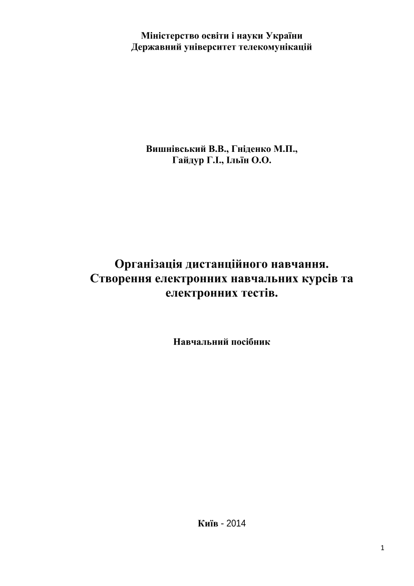 Організація дистанційного навчання. Створення електронних навчальних курсів та електронних тестів [Електронний ресурс] : навчальний посібник / В. В. Вишнівський, М. П. Гніденко, Г. І. Гайдур, О. О. Ільїн ; ДУТ. – Електрон. текст. дані. – Київ : ДУТ, 2014.