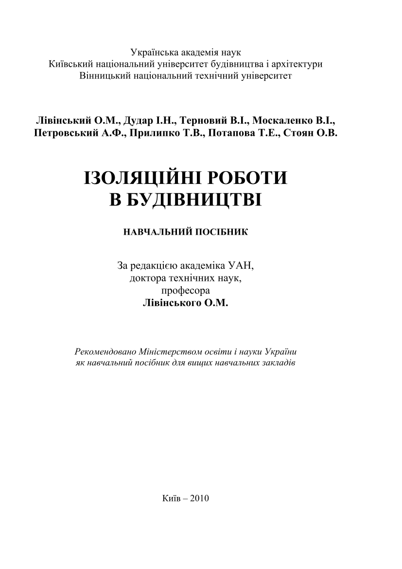 Ізоляційні роботи в будівництві [Електронний ресурс] : навчальний посібник / О. М. Лівінський, І. Н. Дудар, В. І. Терновий [та ін.] ; УАН, КНУБА, ВНТУ ; за ред. О. М. Лівінського. – Електрон. текст. дані. – Київ : МП Леся, 2010.