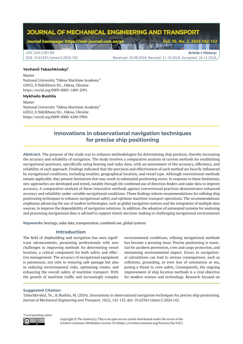 Innovations in observational navigation techniques for precise ship positioning [Електронний ресурс] / Ye. Tabachkivskyi, M. Bushlia