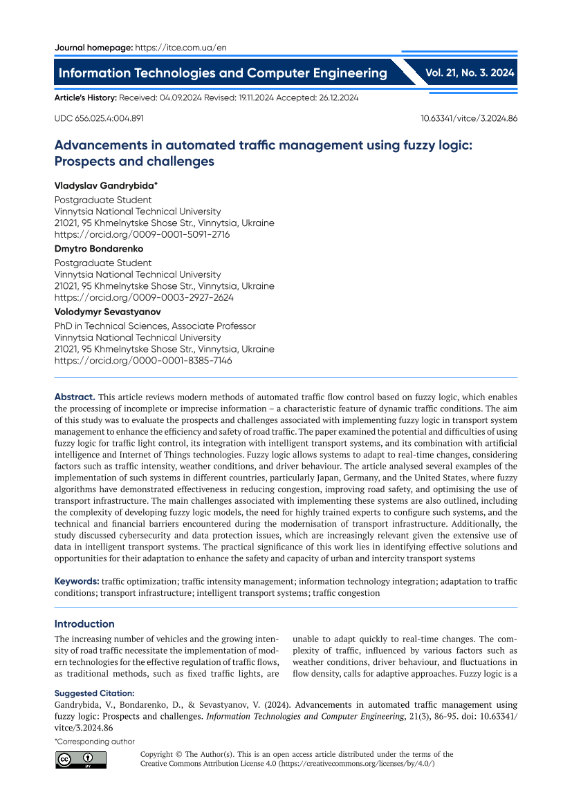 Advancements in automated traffic management using fuzzy logic: Prospects and challenges [Електронний ресурс] / V. Gandrybida, D. Bondarenko, V. Sevastyanov