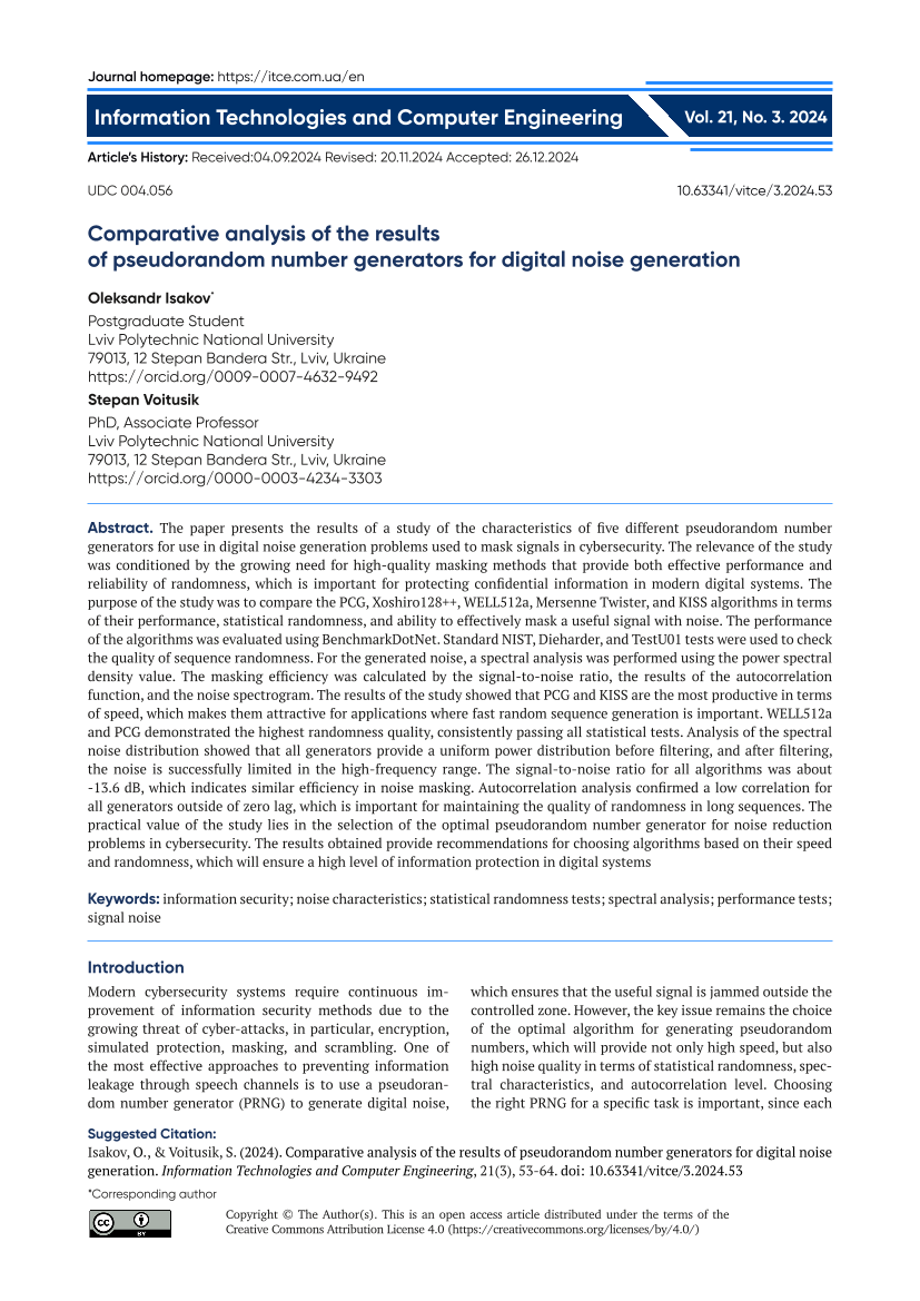 Isakov, O. Comparative analysis of the results of pseudorandom number generators for digital noise generation [Електронний ресурс] / O. Isakov, S. Voitusik // Інформаційні технології та комп'ютерна інженерія. – 2024. – Т. 21, № 3. – P. 53-64. – DOI: https://doi.org/10.63341/vitce/3.2024.53.