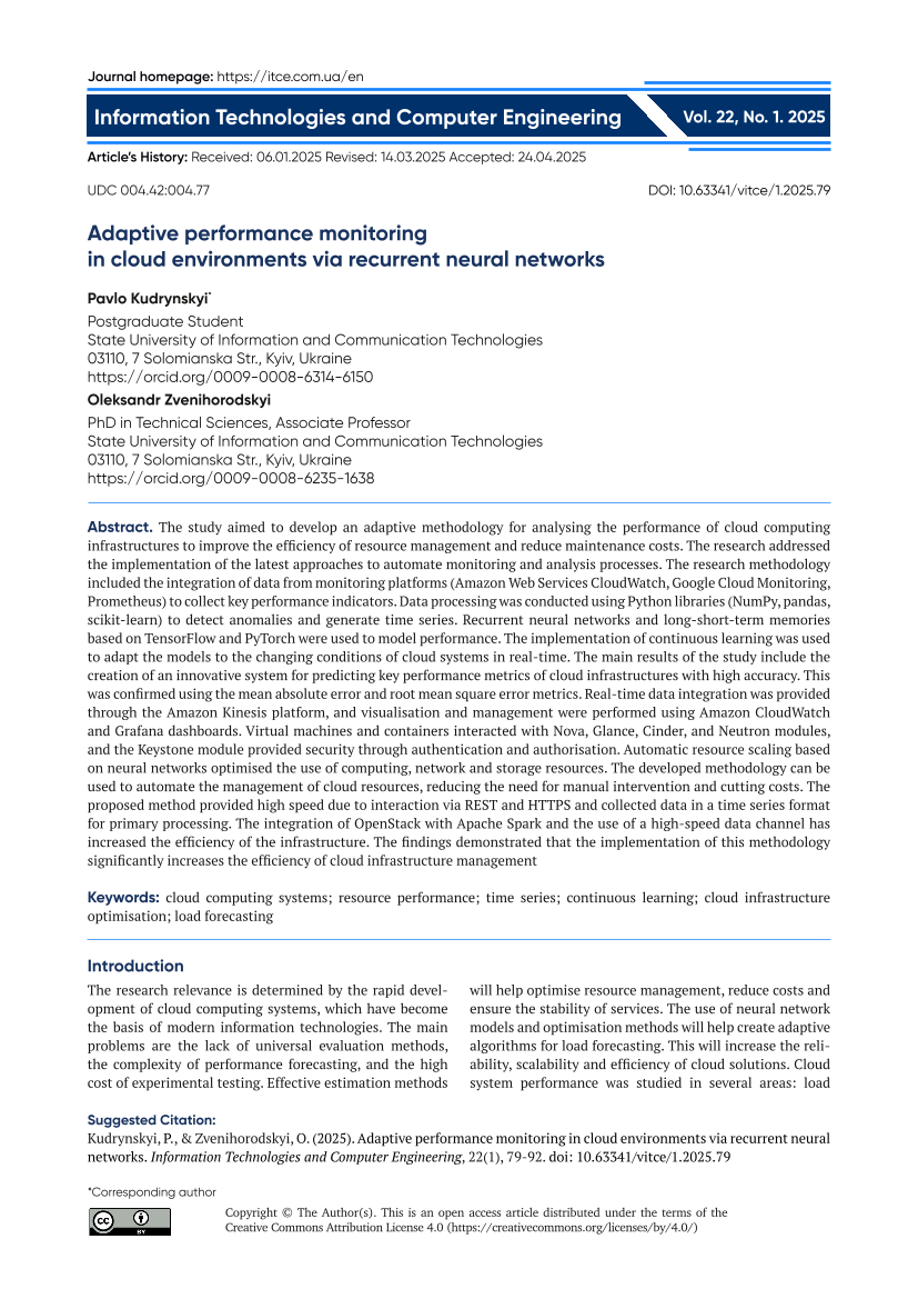 Kudrynskyi, P. Adaptive performance monitoring in cloud environments via recurrent neural networks [Електронний ресурс] / P. Kudrynskyi, O. Zvenihorodskyi // Інформаційні технології та комп'ютерна інженерія. – 2025. – Т. 22, № 1. – P. 79-92. – DOI: https://doi.org/10.63341/vitce/1.2025.79.