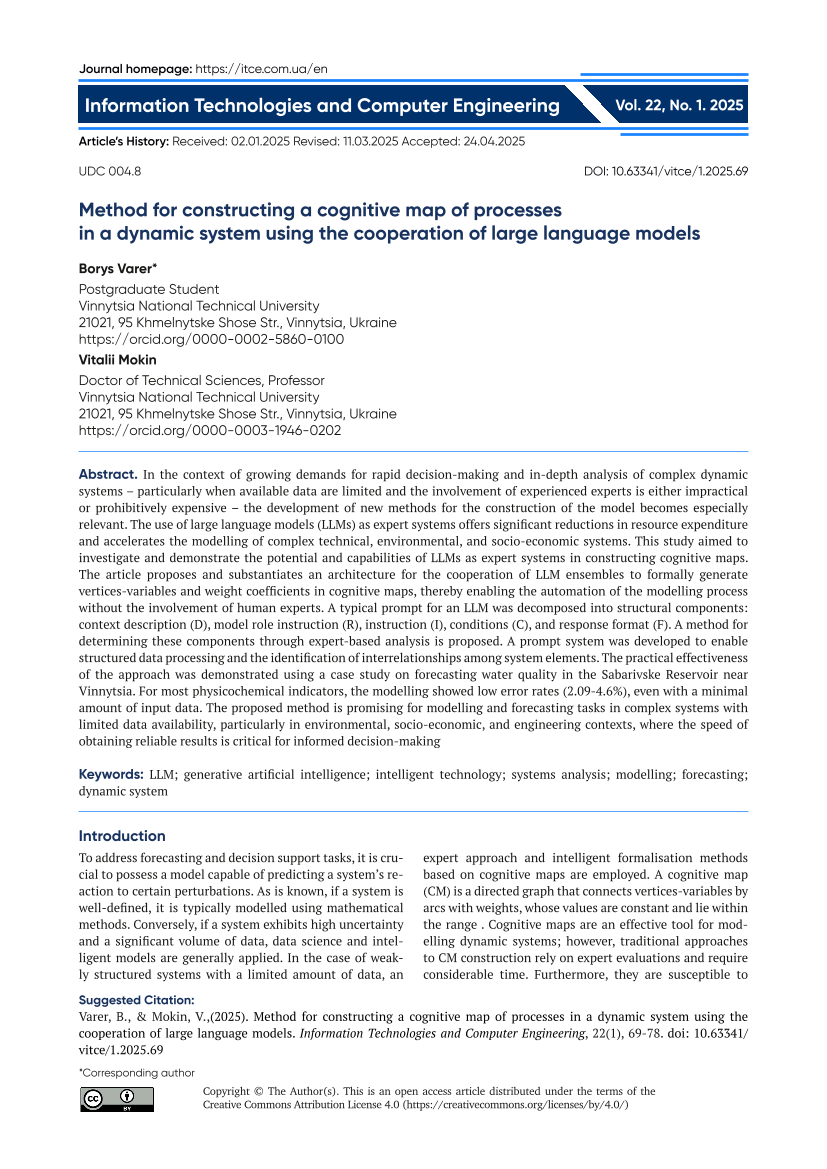 Varer, B. Method for constructing a cognitive map of processes in a dynamic system using the cooperation of large language models [Електронний ресурс] / B. Varer, V. Mokin // Інформаційні технології та комп'ютерна інженерія. – 2025. – Т. 22, № 1. – P. 69-78. – DOI: https://doi.org/10.63341/vitce/1.2025.69.