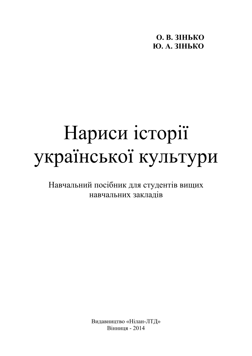 Зінько, О. В. Нариси історії української культури [Електронний ресурс] : навчальний посібник / О. В. Зінько, Ю. А. Зінько. – 2-ге вид.: доп., перероб. – Електрон. текст. дані. – Вінниця : Нілан-ЛТД, 2014.